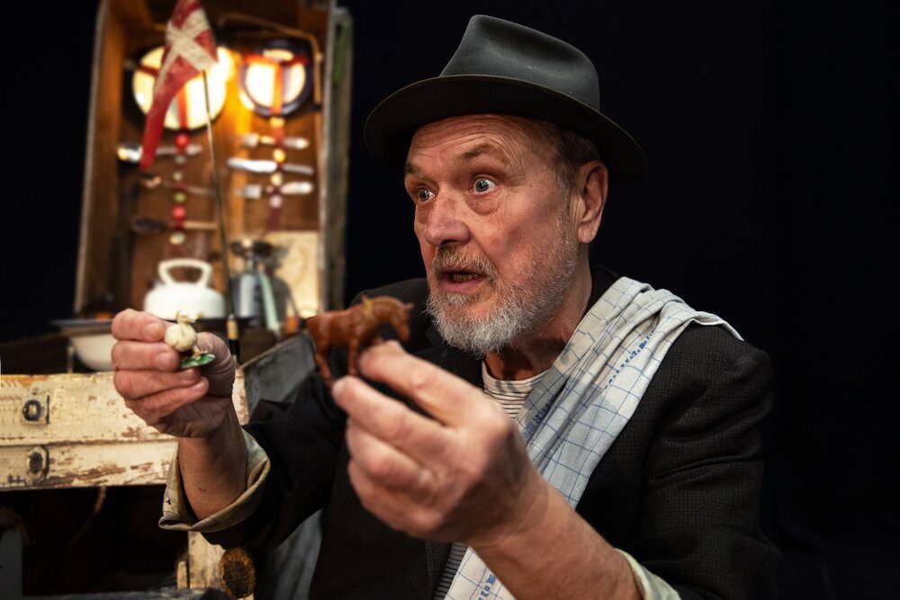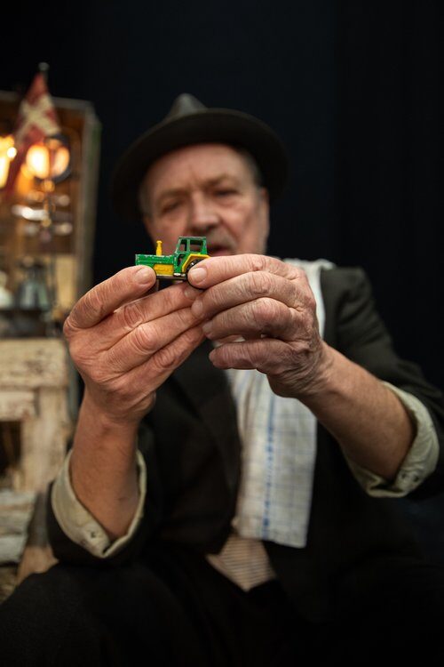 Gennem små træfigurer og bondegårdsdyr, barbergrej og bistade åbner manden op for sit liv: med kone, børn og en traktor, der gifter sig med en gylletank.